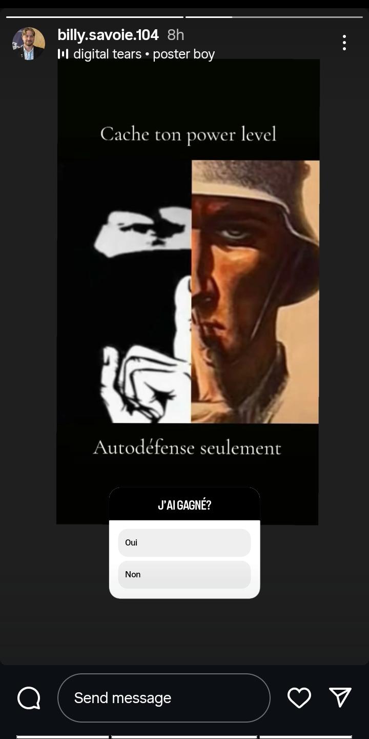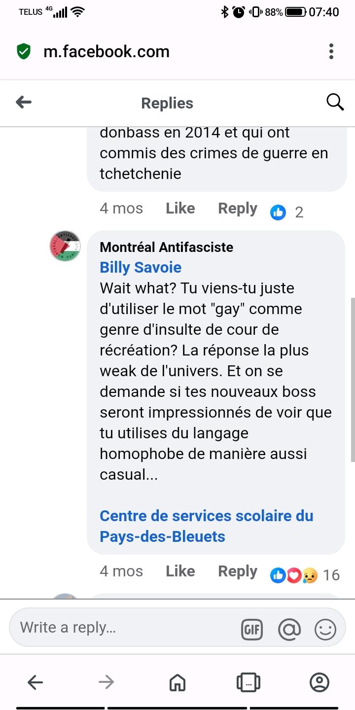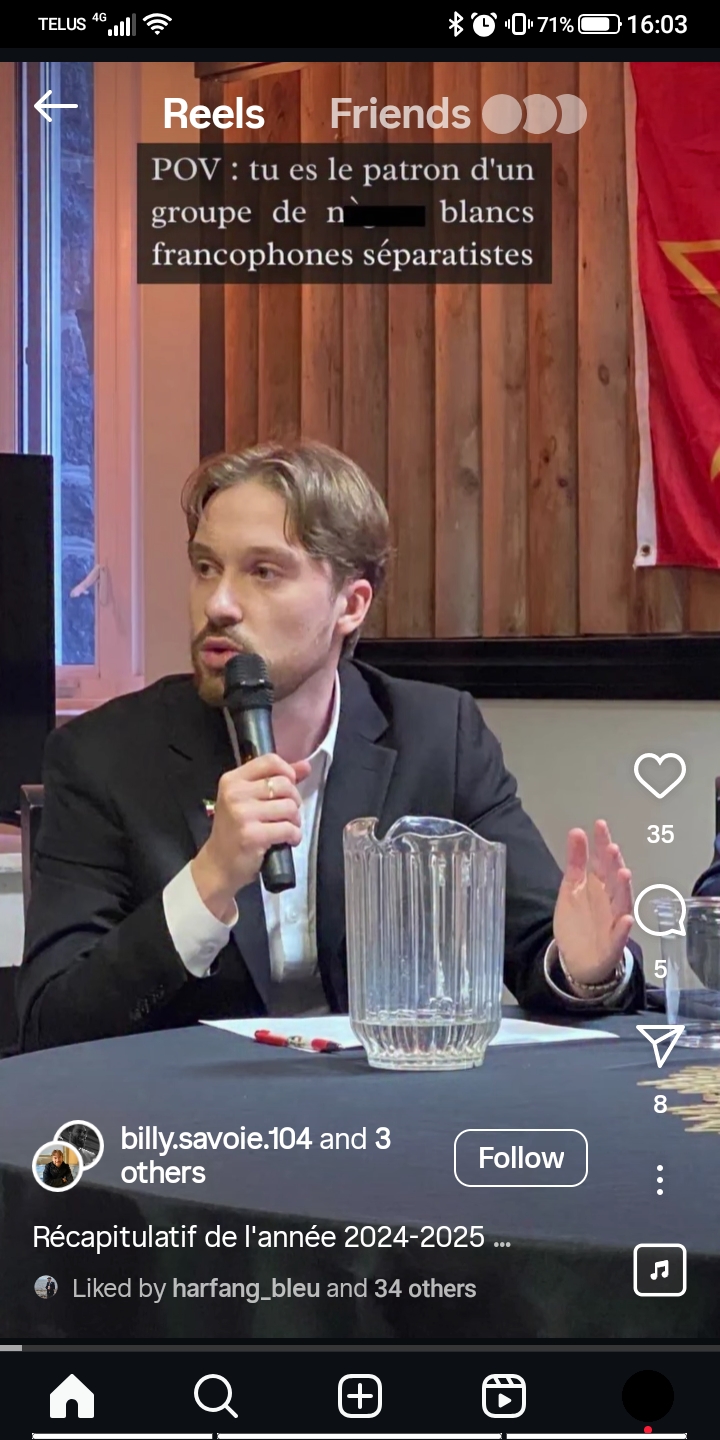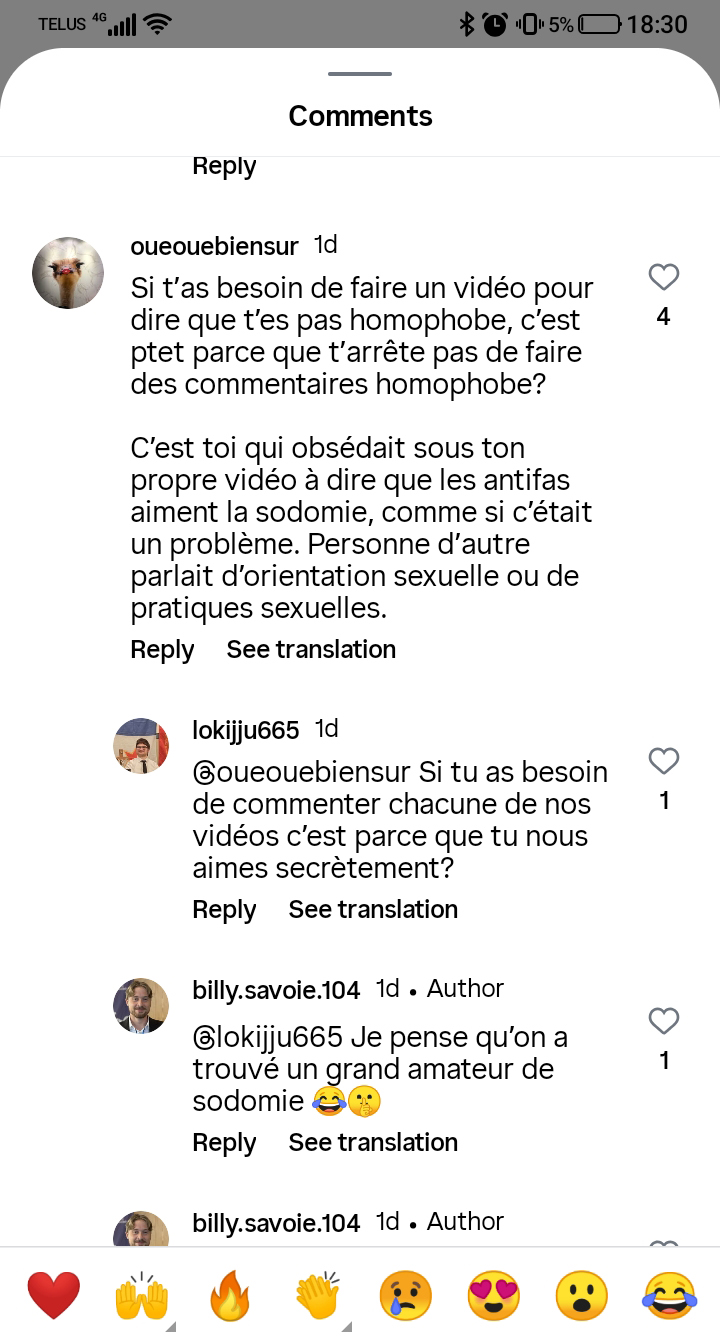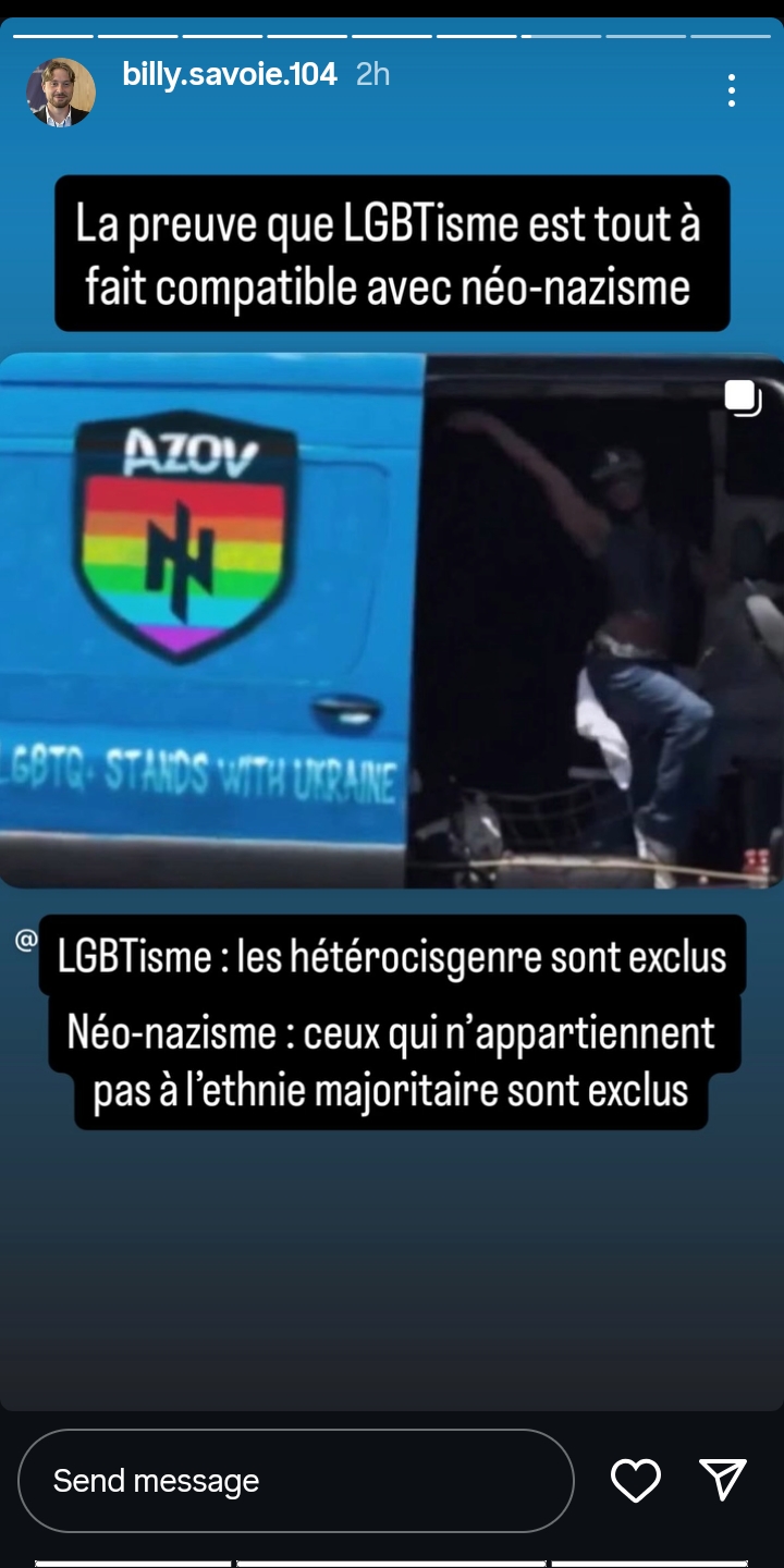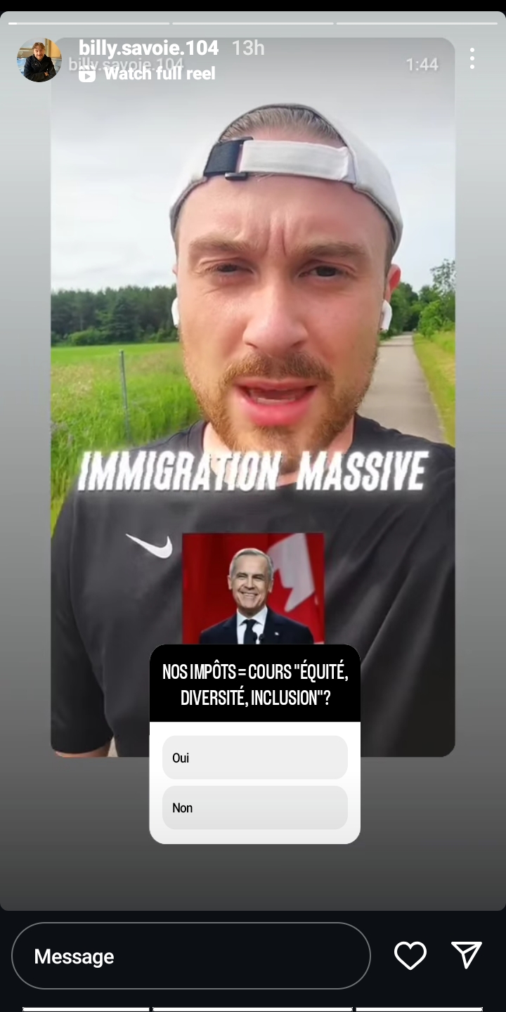 Il est clair que Billy Savoie fait exactement l’inverse : au lieu de limiter l’accès à ses comptes, il cherche à avoir le plus d’abonné·es possible parmi ses élèves, et se réjouit de cette attention. Quant au « rôle de modèle », un enseignant qui dénigre le programme d’enseignement, qui sacre, qui tient des propos homophobes partout et qui participe de manière répétée à des rassemblements identitaires, habillé en chemise brune avec une milice de pacotille, est à peu près le plus loin que l’on puisse être d’un « rôle de modèle »!